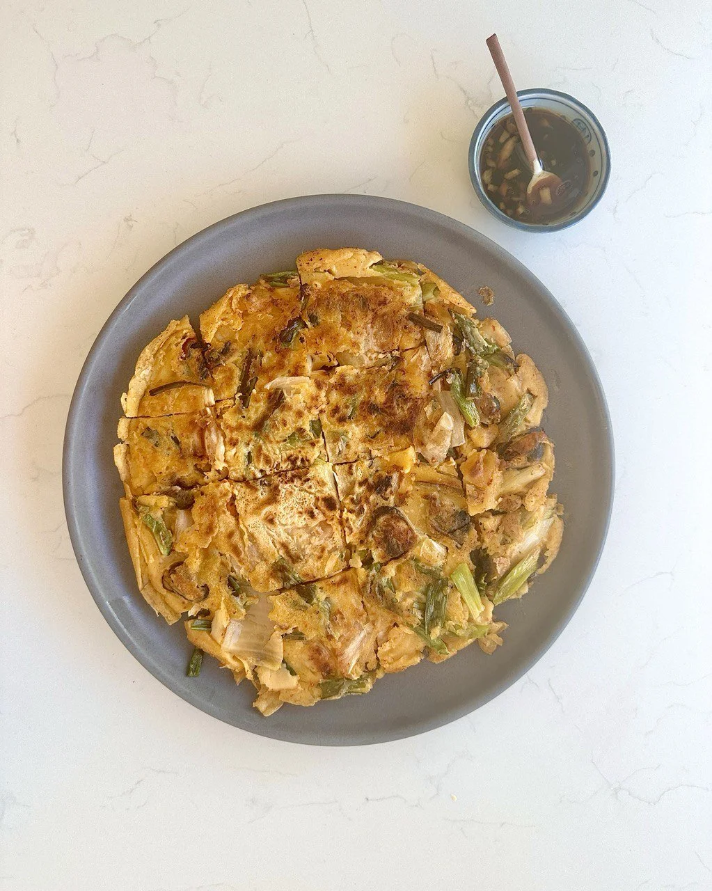 6. Cut pajeon with kitchen shears and serve with sauce alongside.